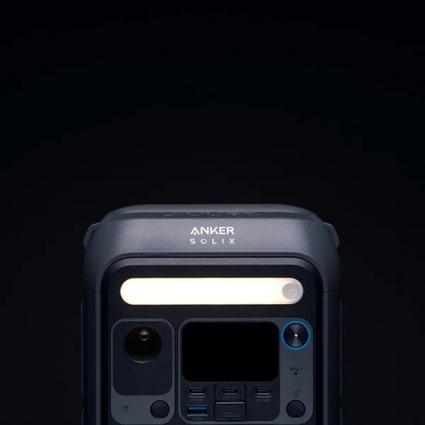 Anker Solix C300 Portable Power Stationには、ボタン一つで点灯できる大型のLEDライトを前面に搭載する。