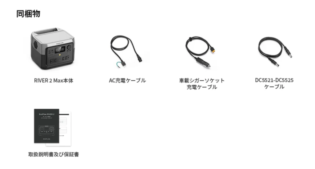 ECOFLOWのRIVER 2 Maxには、はじめからポータブル電源本体・AC充電ケーブル・車載シガーソケット充電ケーブル・DCケーブル・取扱説明書を付属する。
