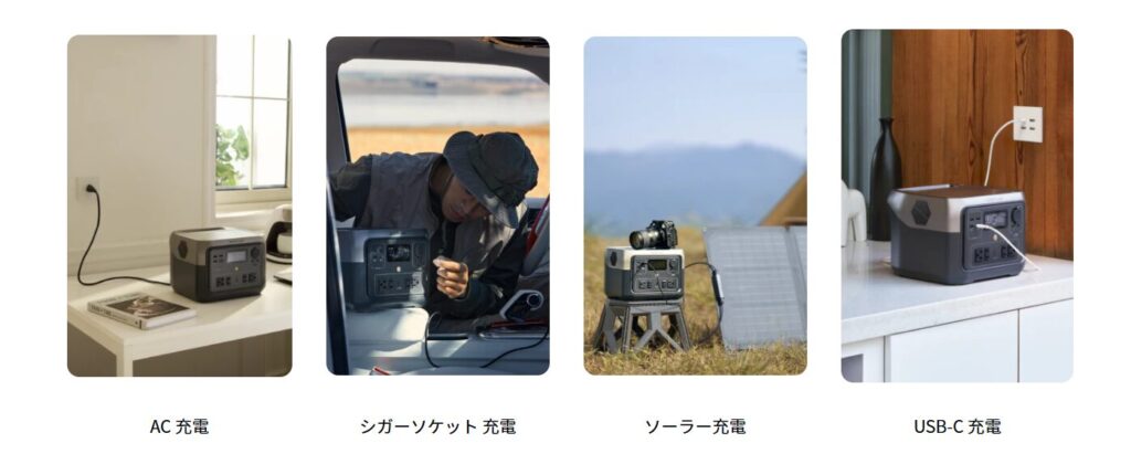 また、ACコンセントからの充電だけではなく、ソーラーパネルやシガーソケット、USBポートからも充電が可能となっている。