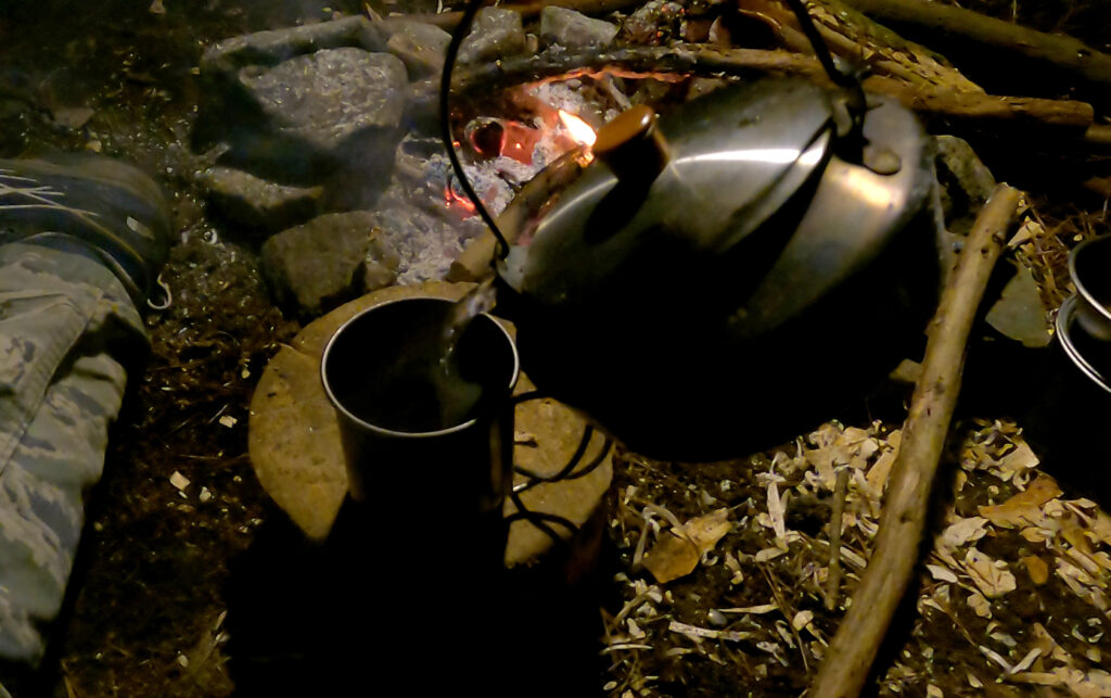 上の写真は、筆者がケトルをつかって直火でお湯を沸かしているものです。