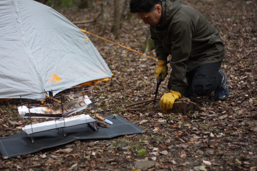 ソロキャンプでは焚き火を楽しんだり、ナイフや鉈、斧など、刃物をつかってブッシュクラフトをしたりすることがある。
